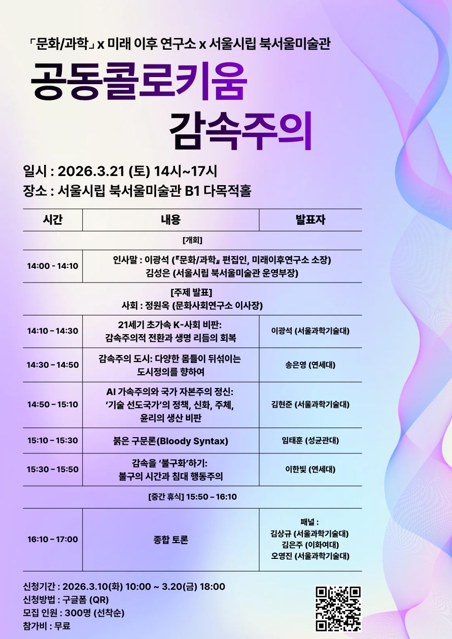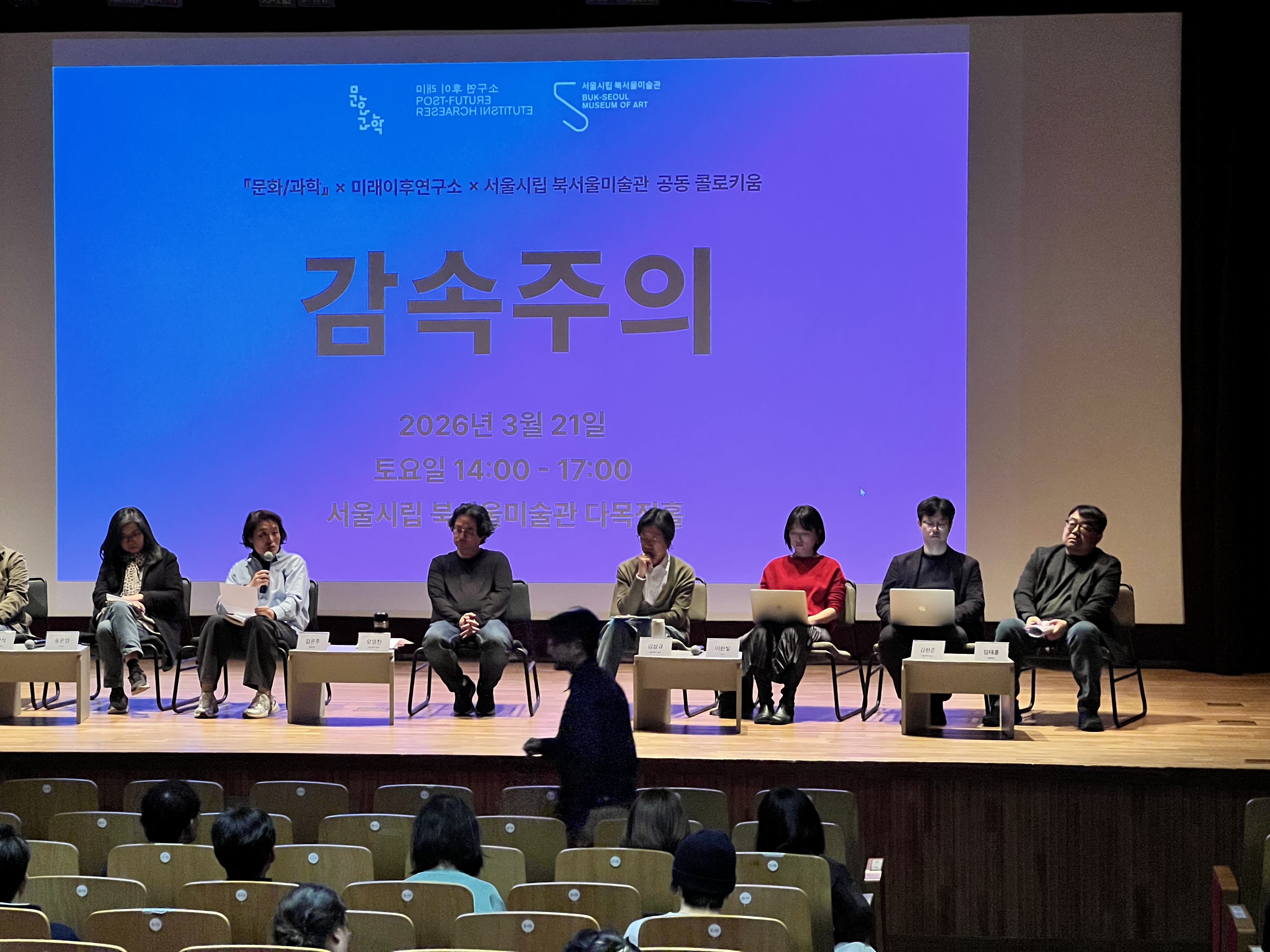『문화/과학』 × 미래이후연구소 × 서울시립 북서울미술관 공동 콜로키움 문화이론 전문 계간지 『문화/과학』 125호(2026년 봄) "감속주의" 특집 발간을 기념하여, 『문화/과학』과 미래이후연구소, 그리고 서울시립 북서울미술관이 공동 콜로키움을 마련했습니다. 오늘날 한국 사회는 성장의 가속 페달을 밟으며 질주하는 ‘초가속의 감옥’에 갇혀 있습니다. 인공지능(AI)과 자본, 데이터가 인간의 리듬을 앞지르는 시대에, 이번 콜로키움은 질주를 멈추고 공생의 리듬을 발굴하는 ‘감속주의’를 제안합니다. 『문화/과학』 “감속주의” 특집호에 참여한 필진을 발표자로 초대해 공존과 호혜, 그리고 돌봄의 감속적 사유를 나누고, 다가올 사회적 전환의 방향을 함께 탐색해 보고자 합니다. 많은 관심과 참여 부탁드립니다.