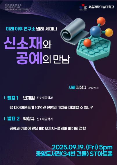 일시: 2025년 9월 19일(금) 오후 5시 장소: 중앙도서관 1층(34번 건물) ST아트홀 사회: 김상규(디자인학과) 발표1) 변재원(신소재공학과) “랩 다이아몬드가 10억년 천연의 가치를 대체할 수 있나?” 10억 년의 세월을 거쳐 만들어지는 천연 다이아몬드는 영원을 상징하는 보석이었으나, 이제 과학기술의 발달로 연구실에서 제조한 고품질의 합성 다이아몬드 보석이 널리 유통되고 있다. 두 종류 다이아몬드의 생성 경로와 물질로서의 물리적 특성을 비교하고, 이로부터 창출되는 가치를 물질완전성, 심미성, 상징성, 사회적, 윤리적, 경제적 측면에서 비교 고찰한다. 발표2) 박창규(신소재공학과) “공학과 예술이 만날 때: 오간자-폴리머 메쉬의 접합” 금속공예디자인학과 정호연 교수와 함께 진행하고 있는 ST융합연구의 진행 상황을 공유한다. 정호연 교수는 오간자-폴리머 메쉬 접합을 이용해 다양한 예술품을 만들고 있는데 박창규 교수는 이 부분의 자동화 및 데이터화(접합 강도, 투과도, 색상 정보)를 위한 연구를 진행 중이다.