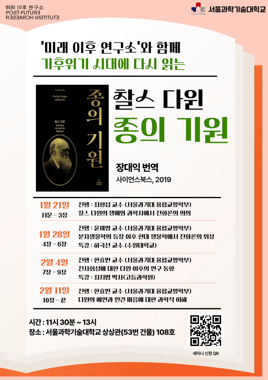 21세기 초입의 지구는 거대한 변곡점 위에 서 있습니다. 해수면의 상승, 생태계 붕괴, 예측할 수 없는 기후의 불안정성은 우리에게 호모 사피엔스라는 종이 지구와 맺어온 관계의 역사적 결과를 정면으로 응시하라고 요구합니다. 다윈이 말한 자연선택은 단순한 생물학적 원리가 아니라, 생명과 환경이 서로를 빚어내는 장구한 상호작용의 기록입니다. 우리는 이 고전을 통해 ‘어떻게 우리가 되었는가’를 질문함과 동시에, ‘지금 이 모습으로 계속 존재할 수 있는가’를 묻고자 합니다. 호모 사피엔스의 출현과 적응, 경쟁과 공존, 그 모든 진화적 궤적은 6차 대멸종을 예고하는 이 시대에 기후위기의 심각성을 이해하기 위한 하나의 지적 나침반이 될 것입니다. 세미나 날짜는 1월 21일, 1월 28일, 2월 4일, 2월 11일로 총 4회에 걸쳐 <종의 기원>을 완독할 계획입니다. 명시된 날짜들은 모두 수요일이며 점심시간인 11시 30분부터 13시까지를 기본으로 하고, 최대 2시간 이내로 진행합니다. 이번 세미나는 서울과기대 융합교양학부의 윤재영, 최형섭, 한효빈 교수님께서 이끌어주실 예정입니다. <종의 기원>을 새로 구입하실 경우에 는 ‘다윈포럼’에서 기획하고 최재천 박사님이 감수하신 아래 책을 추천합니다. 찰스 다윈, 장대익 번역, <종의 기원>, 사이언스북스, 2019.
